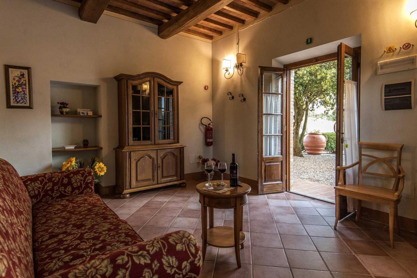 Large Two-Bedroom Apartment - Ground Floor (4 Adults). Overlooking the central courtyard of the property, this apartment is located at ground floor of the main building. It comes with traditional Tuscan-style décor and features a reserved outdoor area with a table and chairs. The apartment consists of 2 bedrooms, 2 bathrooms, a living room and separate kitchen. ;